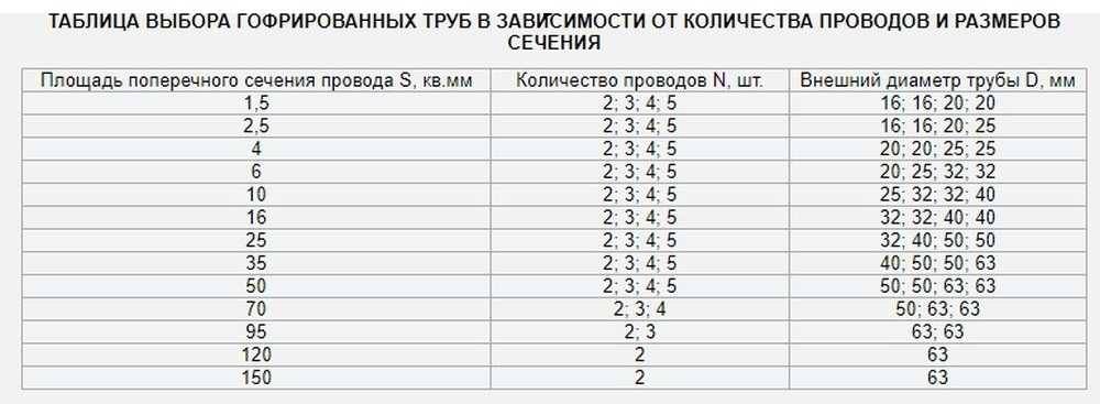 Таблица выбора диаметра гофры для кабеля и проводов в зависимости от сечения и количества проводов