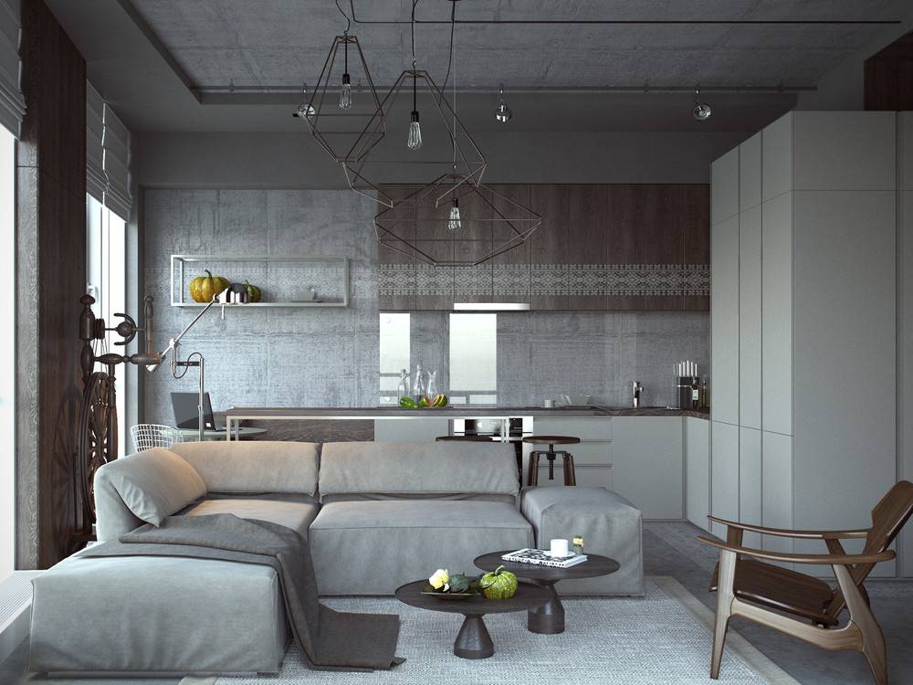 Стены в этом стиле зачастую однотонно окрашивают темной краской. Мебель выбирают простую и даже грубоватую. В качестве светильников находят экземпляры, стилизованные под техническое освещение на заводах. Цветовая гамма варьируется от больничной белизны до темных цветов, как в цеху.