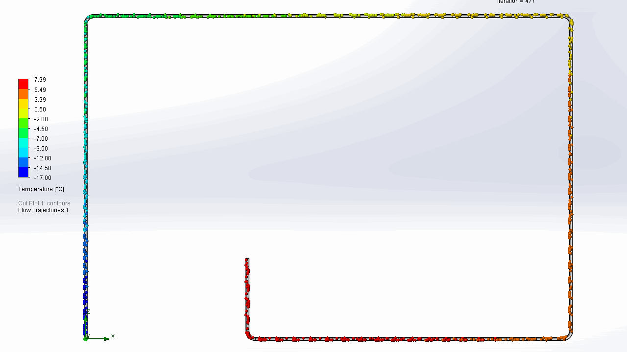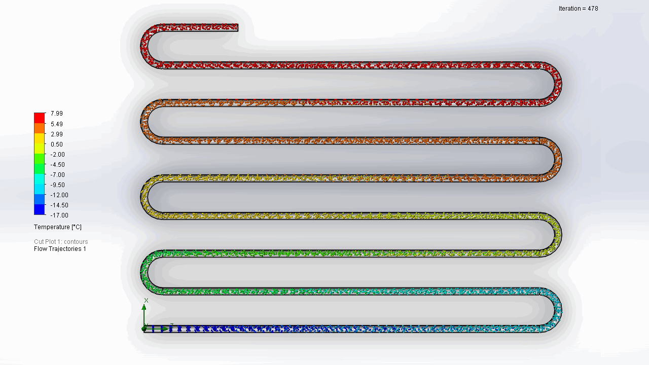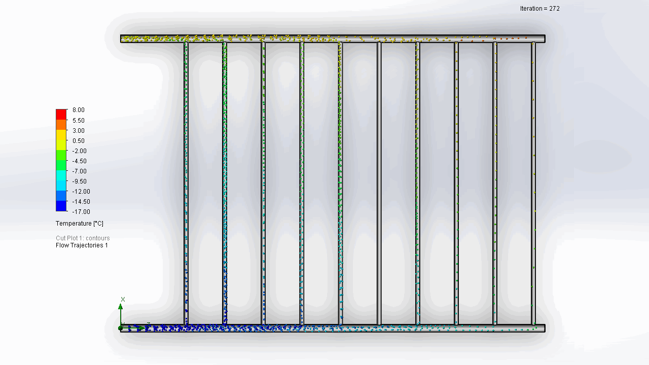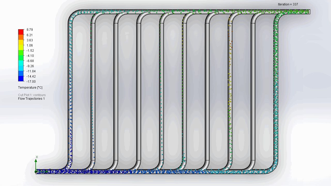 Для ответа на эти вопросы проведен численный расчет на симуляторе CFD Solidworks. Моделировался пример выше (Z-форма), а так же случаи других конфигураций теплообменника.