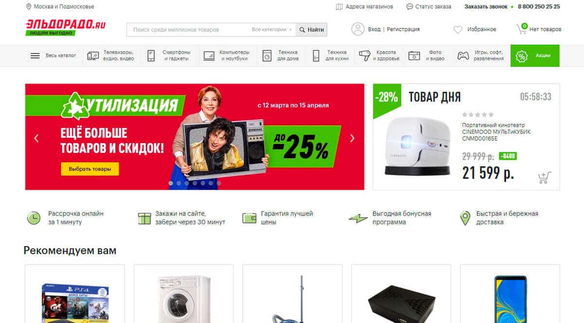 На прилавках онлайн магазина есть все виды товаров, которые можно найти в розничной сети. В сегменте бытовой техники Эльдорадо всегда большой выбор приборов (аудио- и видеотехника, гаджеты, ноутбуки, фотоаппаратура). На сайте можно нередко встретить специальные предложения, скидки и товары дня.