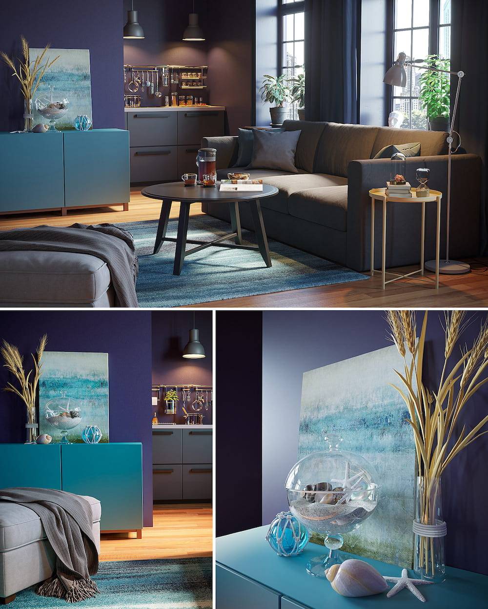 Но для интерьера два оттенка — это слишком монотонно и скучно. Гораздо интереснее комнаты оформленные с сочетанием трех, четырех или более цветов. При этом использовать цвета в равных пропорциях неправильно. Один-два из них выбираются как основные, их «много». В эти цвета окрашивают стены, пол, они присутствуют в обивке мебели, текстиле. Еще один-два используется как дополнительные. Их не так много, но они заметны. Остальные — сколько бы их не было — служат для внесения разнообразия и акцентов. Они присутствуют в небольших количествах — это детали декора, подушки и т.п. Если вы присмотритесь к интерьерам, которые вам нравятся, скорее всего, обнаружите такую закономерность распределения цветов.