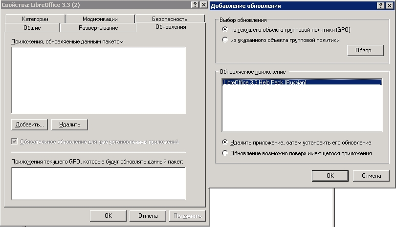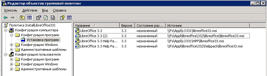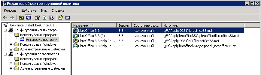 Проделываем то же самое для Help Pack. И теперь после применения групповых политик и последующей перезагрузке рабочих станций взамен старой версии устанавливается новая версия LibreOffice.