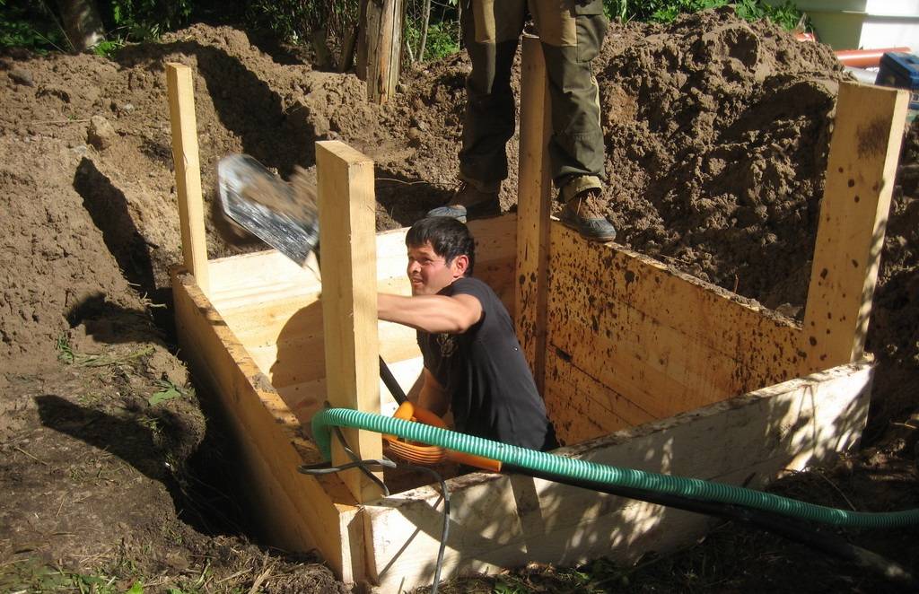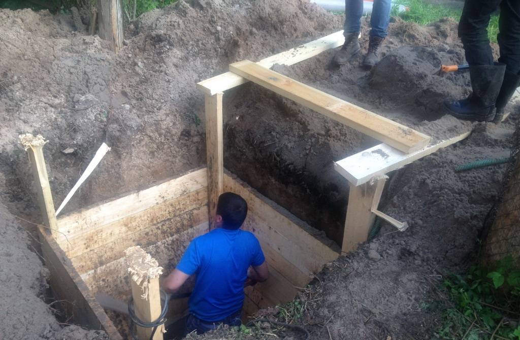 Завершение земляных работ: промежуток между стенками ямы и внешней стороной стенок короба засыпается любым доступным материалом; обычно – вынутым при копке котлована грунтом.