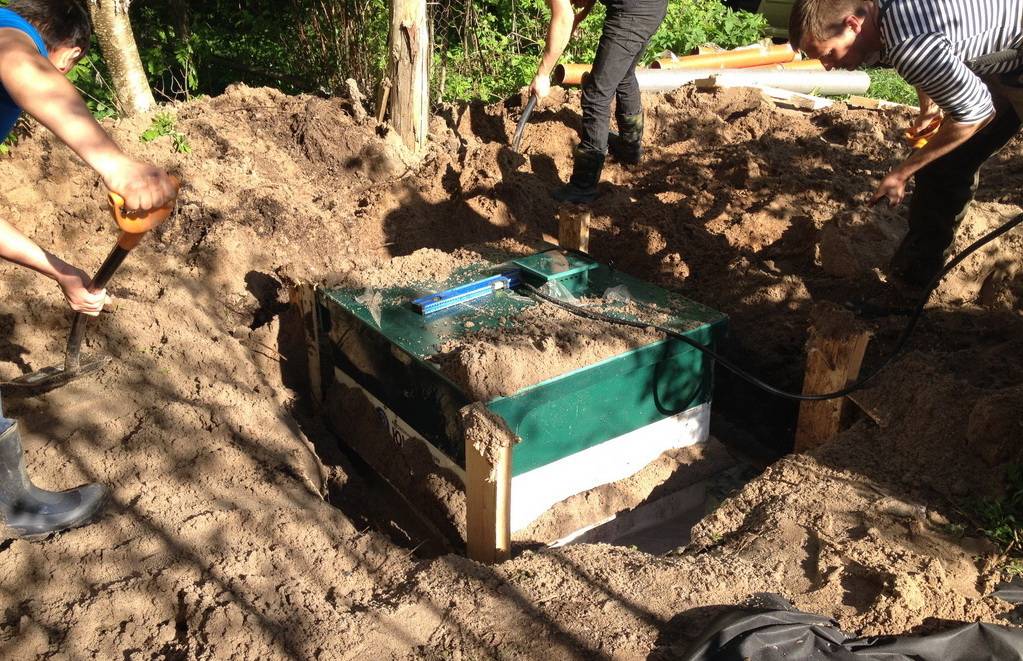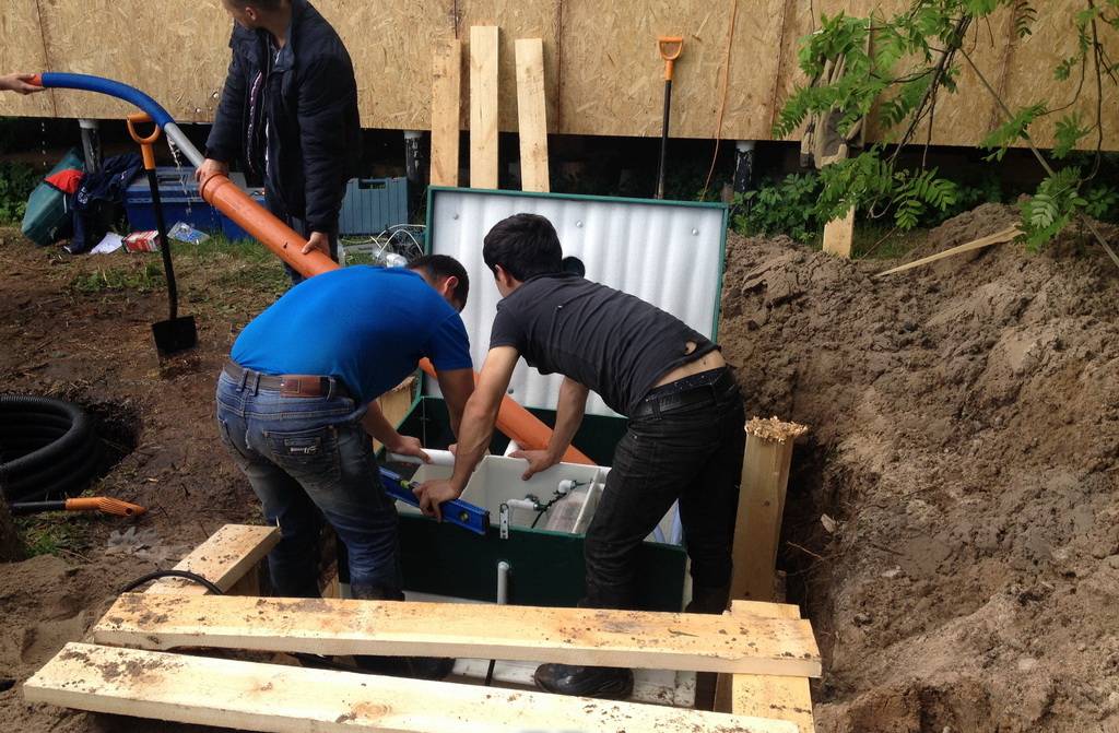 - Установка анаэробного септика. Производится с учетом установки фиксирующего элемента (бетонного основания, крепежей и т.д.).