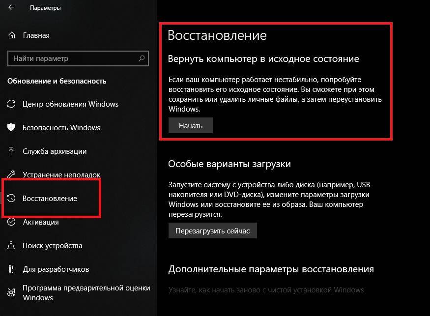 - В открывшемся окне выберете «Восстановление» на панели слева.