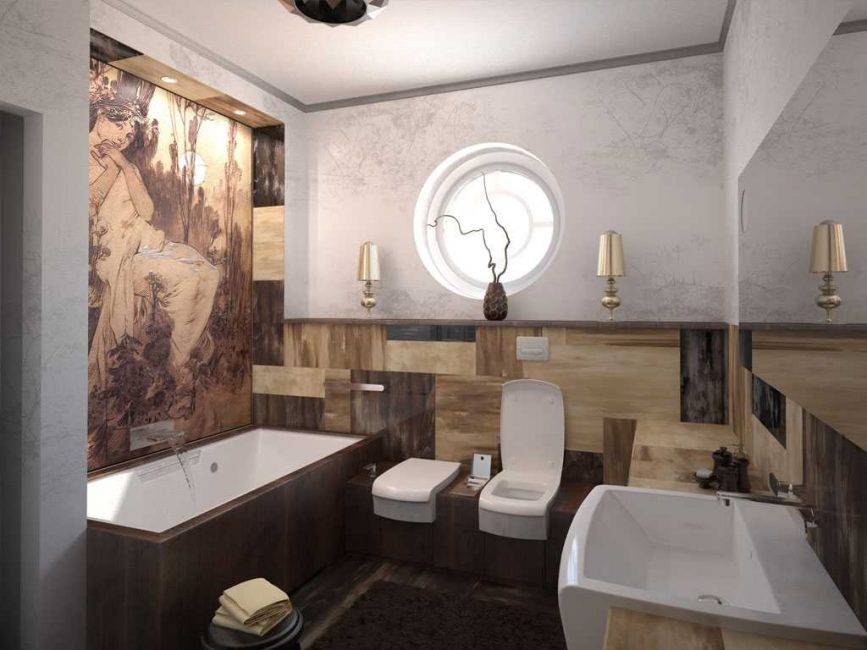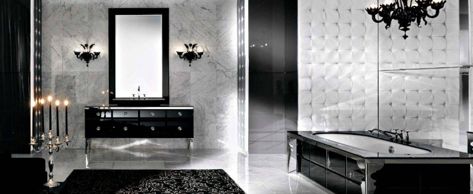 Сдержанная роскошь Арт-деко интересно смотрится в больших ванных комнатах. Насколько возможно, здесь применяются хромированные элементы, стекло, мраморные и глянцевые поверхности. Преимущество отдается светлым оттенкам, особенно в оформлении потолка.