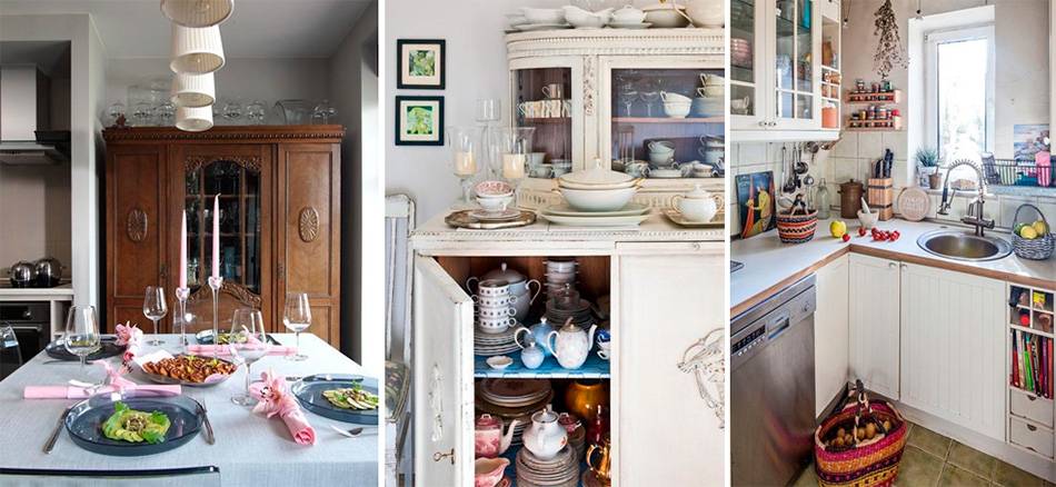 Мебель для такой кухни подобрать сложнее. Хорошим решением будут белые деревянные шкафы – они выглядят достаточно стильно и нейтрально. Также стоит позаботиться о стильном серванте со стеклянными дверцами для экспонирования сервизов и посуды.