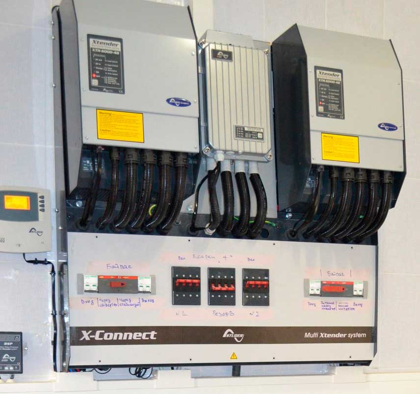 Автономный инвертор. Прибор запитывается от аккумулятора, который получает заряд от солнечных панелей через МРРТ-контроллер. В системе используются батареи разных типов, в том числе высокотехнологичные литиевые аккумуляторы.