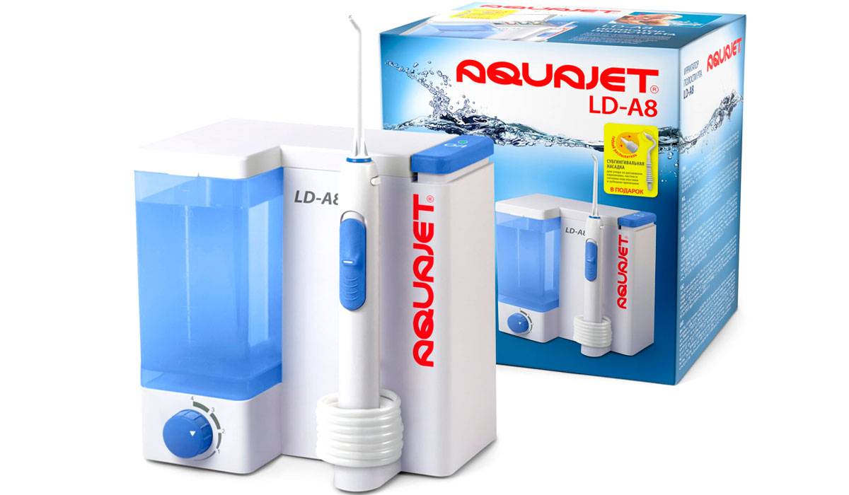 Так же, к недорогим моделям в сфере ирригации относится ирригатор AQUAJET LD-A7. Его особенность в надежности и долговечности использования. Он так же подходит для всей семьи, струи воды, создаваемые им, проникают в самые труднодоступные межзубные промежутки, тем самым гарантируя извлечение от туда остатков пищи и накопившегося налета. Модель проста и комфортна в эксплуатации, служит для профилактики гингивита, парадонтоза и зубного камня. Является отличным помощником для поддержания гигиены во время использования брекет-систем или ношения протезов.