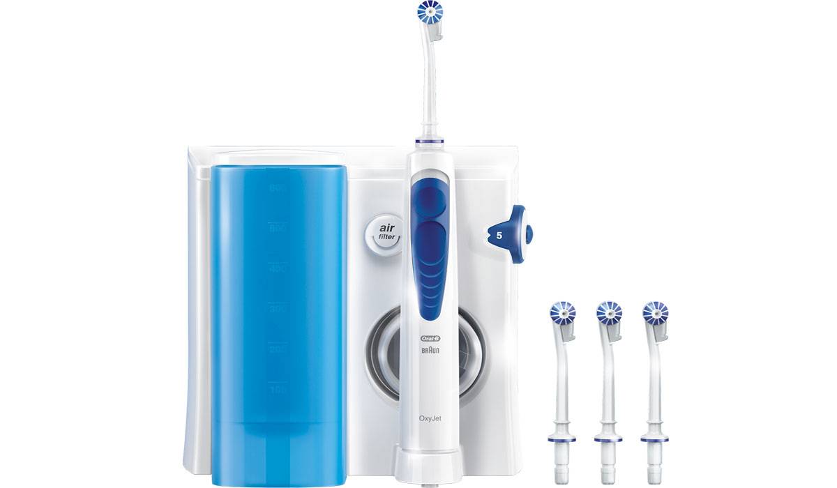 - Oral-b OxyJet MD20 — стационарный ирригатор микропузырькового типа, предназначенный для чувствительных десен. Производителями предусмотрено крепление на стену.