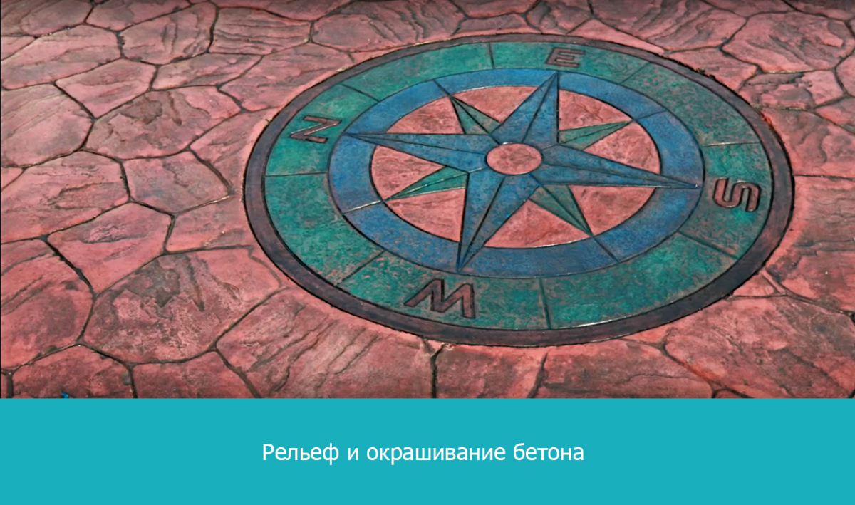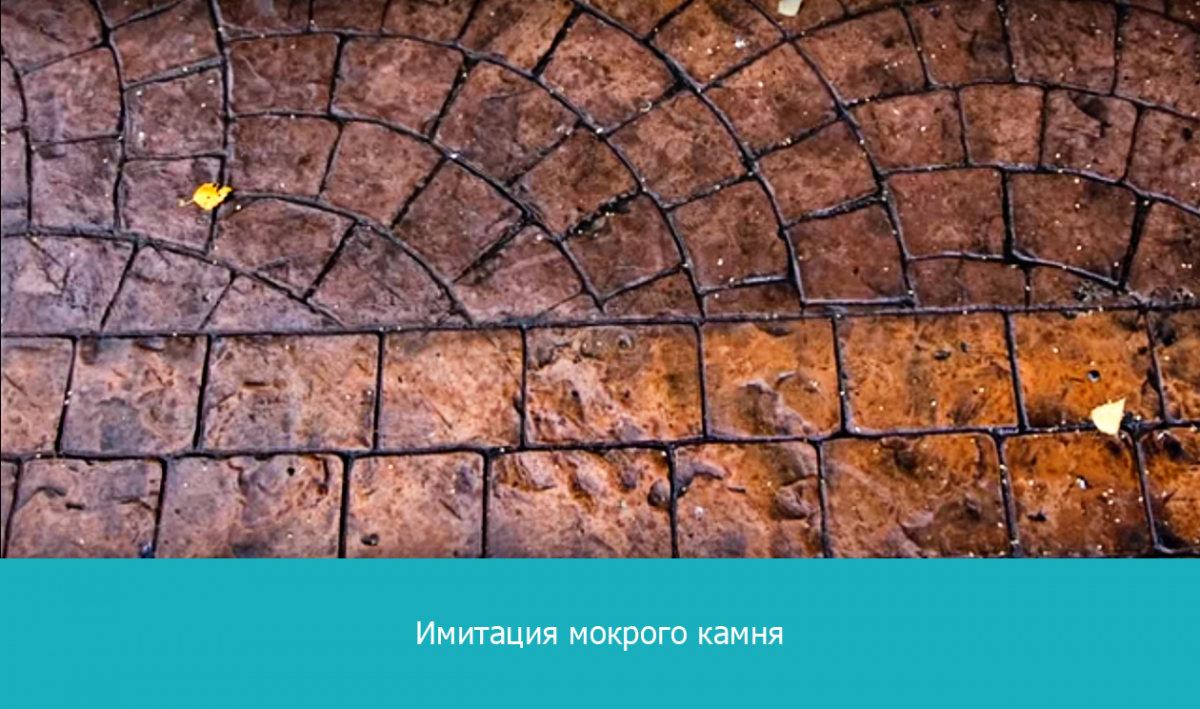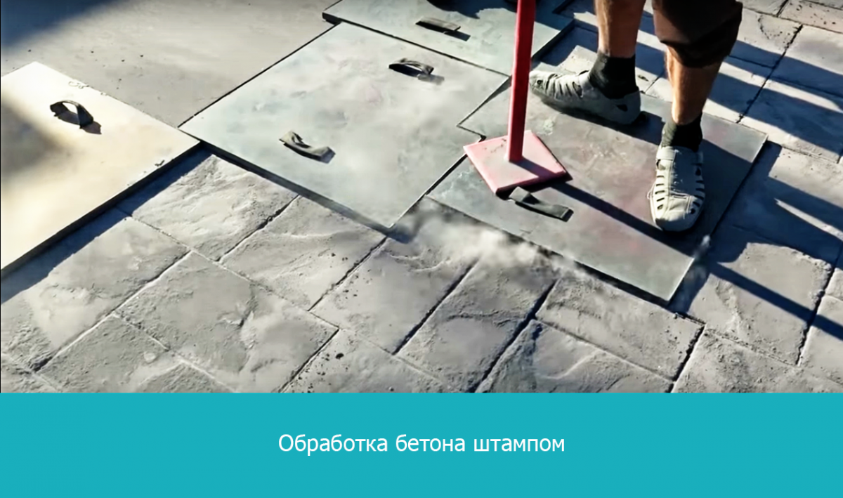 Свежеуложенному бетону можно придать рельеф, имитирующий брусчатку, камень, дерево или другую фактуру методом штамповки. Формы для штамповки бывают мягкими и жесткими. Штампы прикладывают к бетону и прижимают, а затем снимают и присыпают рисунок песком; получается рельефный узор.