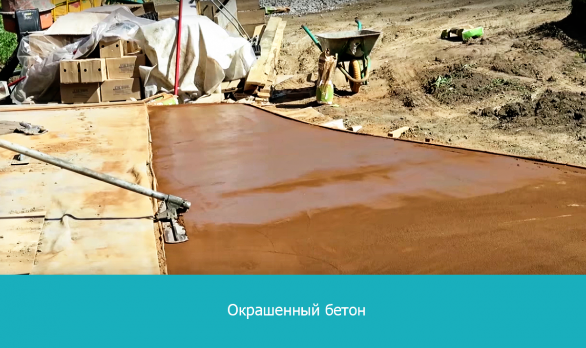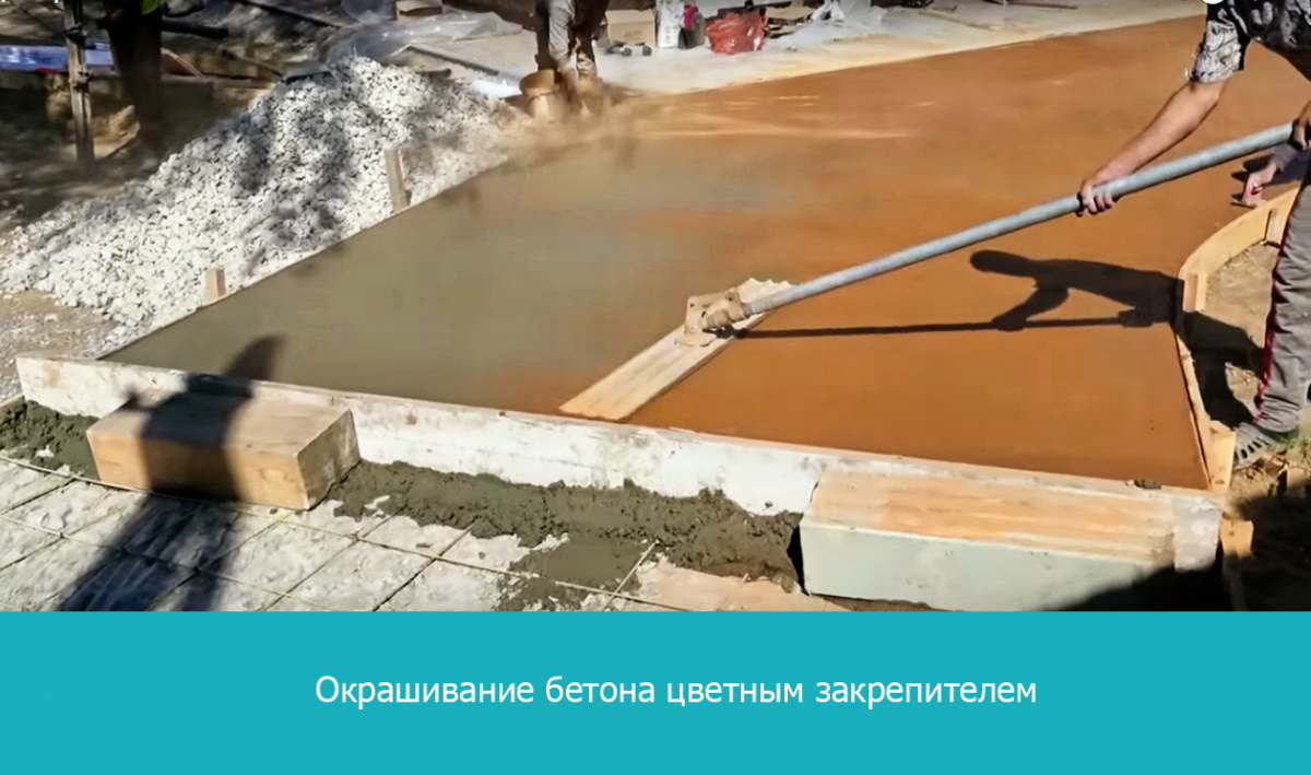 Подкрасить бетон можно не только в массе, но и на поверхности. Для этого можно использовать цветной закрепитель бетона. Его рассыпают по поверхности свежеуложенного бетона и разглаживают.