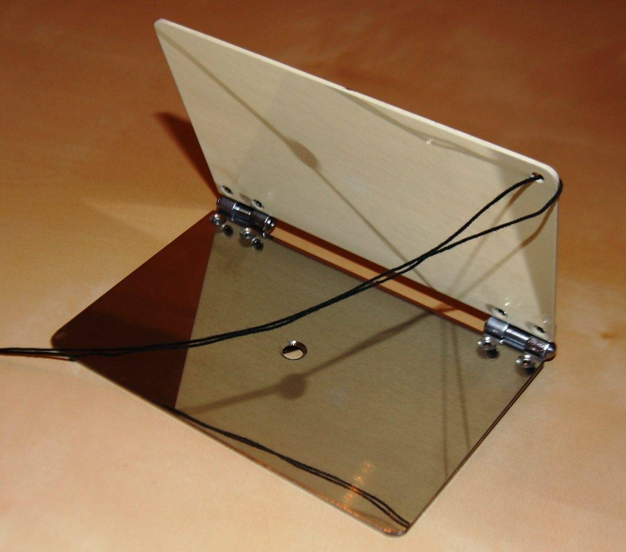Первое поверхностное зеркало, покрытое алюминием и усиленное диэлектрическими покрытиями. Угол падающего света (представленный как светом в зеркале, так и тенью позади него) совпадает с точным углом отражения (отражённый свет падает на стол).