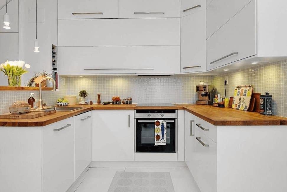 Классика жанра для квадратных кухонь. Рабочая зона состоит из функциональных отделов под хранение, мойку и готовку, для которых покупают модульный L-образный гарнитур. Чтобы по максимуму задействовать угловую зону, устанавливают многоуровневую выдвижную систему.