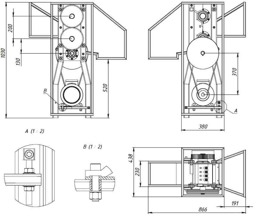 Прочно закрепляют подшипники и шкивы на валу, с противоположной стороны устанавливают шестерни. На заранее подготовленную раму устанавливаем корпус с режущим механизмом и двигатель. Передача крутящего момента от привода будет производиться при помощи ремней через шкивы на валах двигателя и ножей.