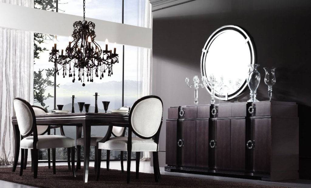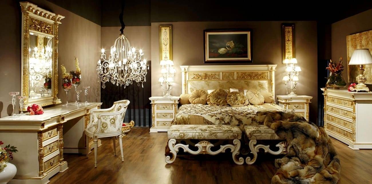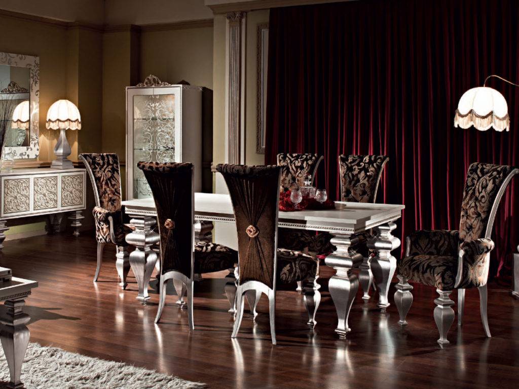 Магнетическую игру света дополнят металлические и хрустальные украшения, при этом тщательно подобранный текстиль завершит утончённую обстановку. Для декоративной обивки мебели подойдут шикарные материи – вельвет, шёлк, атлас, тафта и органза. Все эти материалы обладают неповторимой фактурой и изумительным орнаментом.
