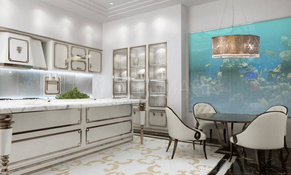 Создавая интерьер квартиры в стиле Арт-Деко, нужно должное внимание уделить и кухне. Здесь подобный интерьер создается теми же способами, что и в остальных помещениях — дорогая мебель, блестящие поверхности и сдержанные цвета