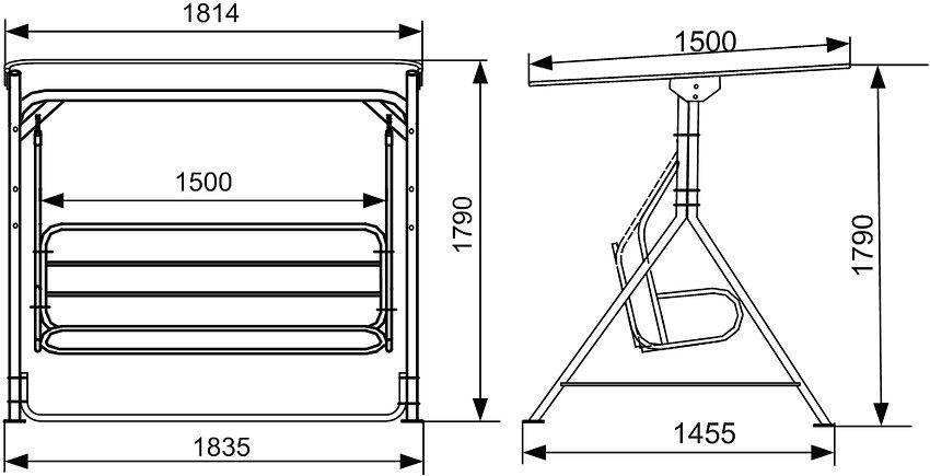 Составляя чертежи такой конструкции, следует исходить из того, что ширина посадочного места для одного человека должна быть не менее 0,5 м. Высота лавочки над землей выбирается такой, чтобы было удобно отталкиваться ногами при качании. Она может качнуться вбок, поэтому чтобы избежать столкновения скамейки с опорами расстояние между ними для веревки выбирается не менее 0,35 м, для цепей — 0,25 м. Высота стоек над землей выбирается 1,7 — 2,5 м в зависимости от способа качания — сидя или стоя. Для лавочки делается отдельный чертеж с указанием размеров и угла наклона спинки.