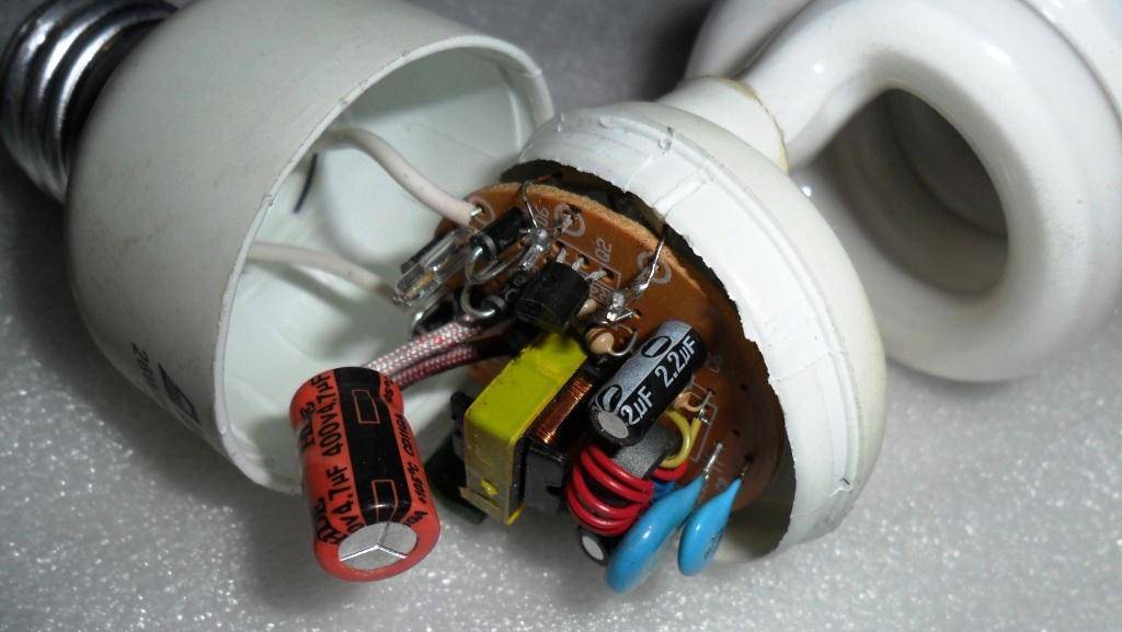 Помимо стандартных конструктивных элементов, таких как колба и цоколь, под корпусом спрятана электронная схема (ЭПРА — пускорегулирующий аппарат). Она есть далеко не в каждой «экономке» (к примеру, в КЛЛ отсутствует). Сегодня ПРА остается самым надежным изделием для работы люминесцентных ламп, от качества которого и зависит срок службы.