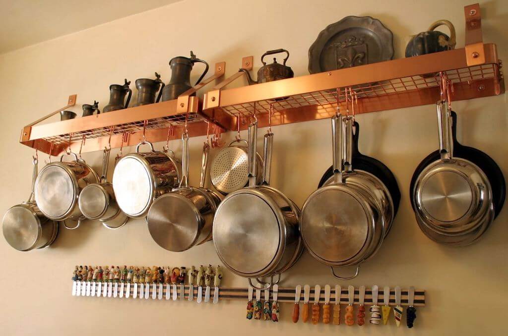 Помимо стандартных полок существуют специальные подвесные аналоги. Использование вертикальных поверхностей значительно экономит место на маленьких кухнях. Иногда подобные конструкции становятся изюминкой интерьера. Подвесные системы удобны для хранения крышек от кастрюль или сковородок на кухне.