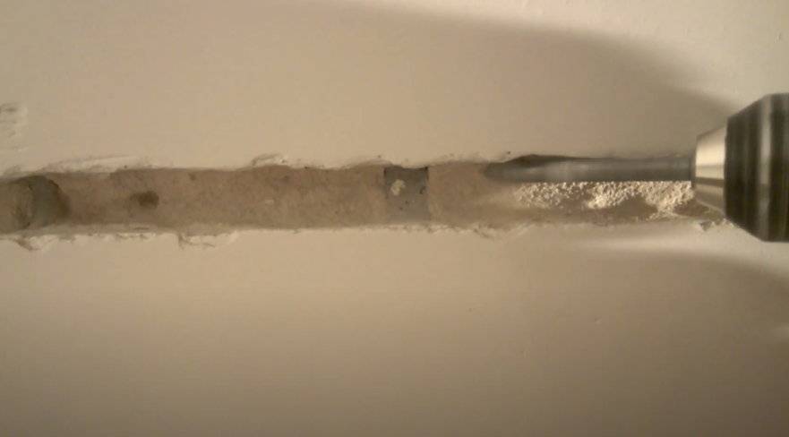 Сверлом или буром по разметке проделывают отверстия. Их глубина не больше 25 мм, расстояние между отверстиями 10-15 мм. Сверло заменяется на лопатку, которой обустраивают желоб под проводку.