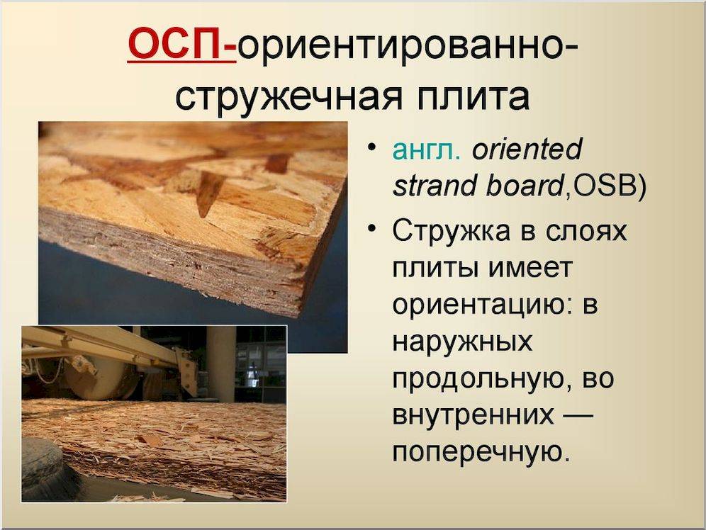 Плита, состоящая из слоёв стружки дерева и клея с примесями для прочности и долговечности. Слой клея с примесями делает плиту единой, служит защитой от постоянного воздействия влаги (дерево набухает от воды и долго сохнет). После всех обработок, плита выходит ровной, прочной, готовой к монтажу.