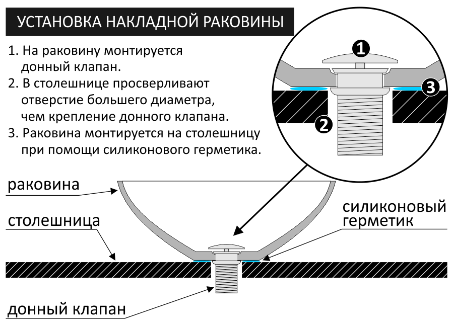 Инструкция по монтажу накладной раковины будет самой простой, так что начнем наш обзор как раз с нее.