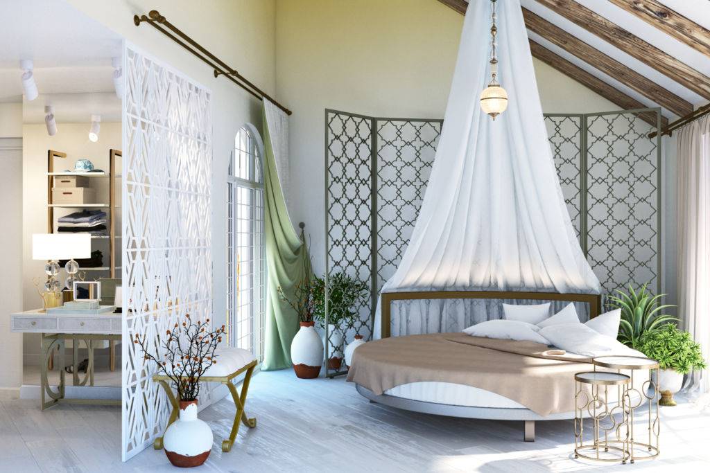 Для спальни в современном стиле подойдет дизайн круглой кровати, обрамленная легким балдахином. Большой полог скроет пространство кровати от чужих глаз и сделает его более личным.