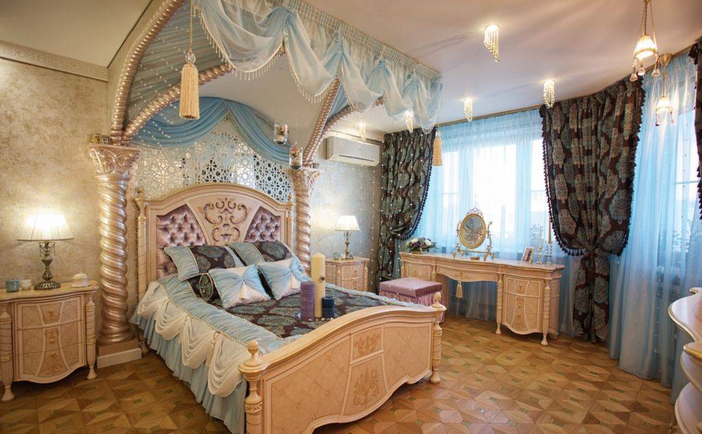 Для спальни в стиле барокко, лучше делать над местом для сна частичную драпировку.