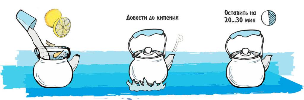 - Проварите лимон 10-15 минут на плите или 2-3 раза прокипятите кислую воду в электроприборе после остывания.