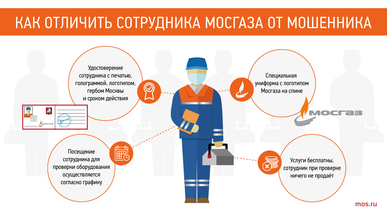 - Сотрудник одет в фирменную форму. Например, в Мосгоргазе это темно-синяя форма с оранжевыми и светоотражающими вставками. Мошенники же носят спецодежду с похожей надписью (Газконтроль, Газстрой).