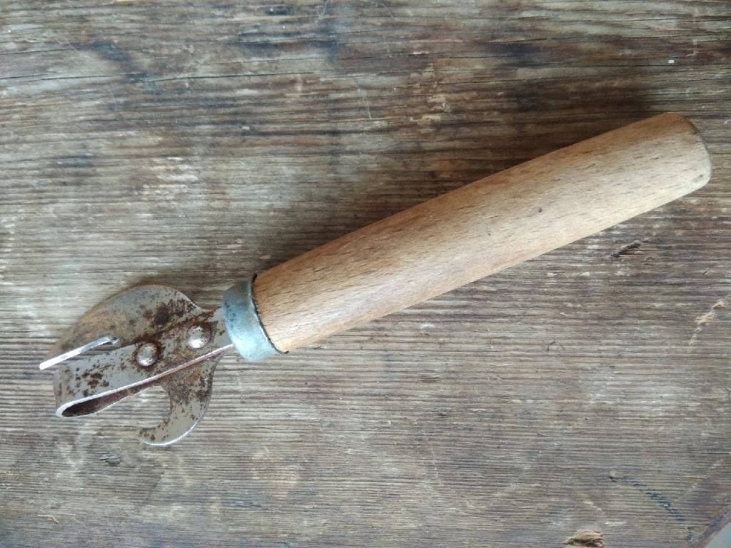 Обычная консервная открывалка представляет из себя нехитрое изобретение, состоящее из деревянной или пластмассовой рукоятки, на конце которой закреплен заточенный с одной стороны металлический нож и металлическая петелька.