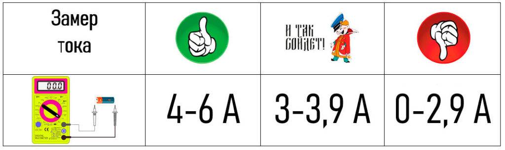 новой исправной батарейке (1,5V) ток должен быть от 4 до 6А.