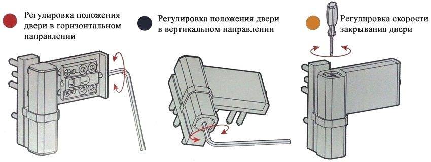 С задней стороны створка регулируется при помощи винтов, расположенных на нижних и верхних петлях. Обычно вместе с фурнитурой поставляется инструкция, в которой указывается схема регулировки. Однако даже при ее отсутствии проблем при настройке обычно не возникает.