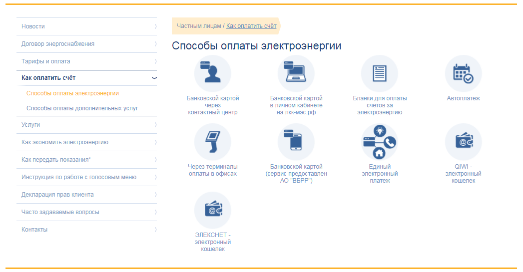 Рядом с предыдущим разделом на главной странице официального сайта Мосэнергосбыта находится раздел «Как оплатить счет», в котором нужно перейти в подраздел «Способы оплаты электроэнергии».
