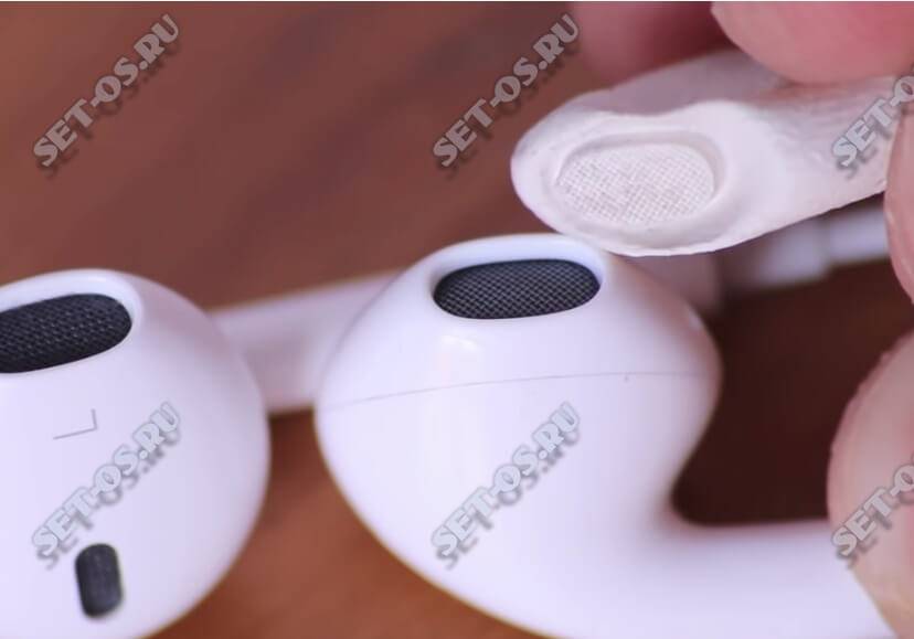 Начнём с проводных Эпл Эрподс. У них есть встроенная несъёмная сеточка, снять которую нельзя. Потому поступим так. Сначала удалим крупные загрязнения зубной щёткой: