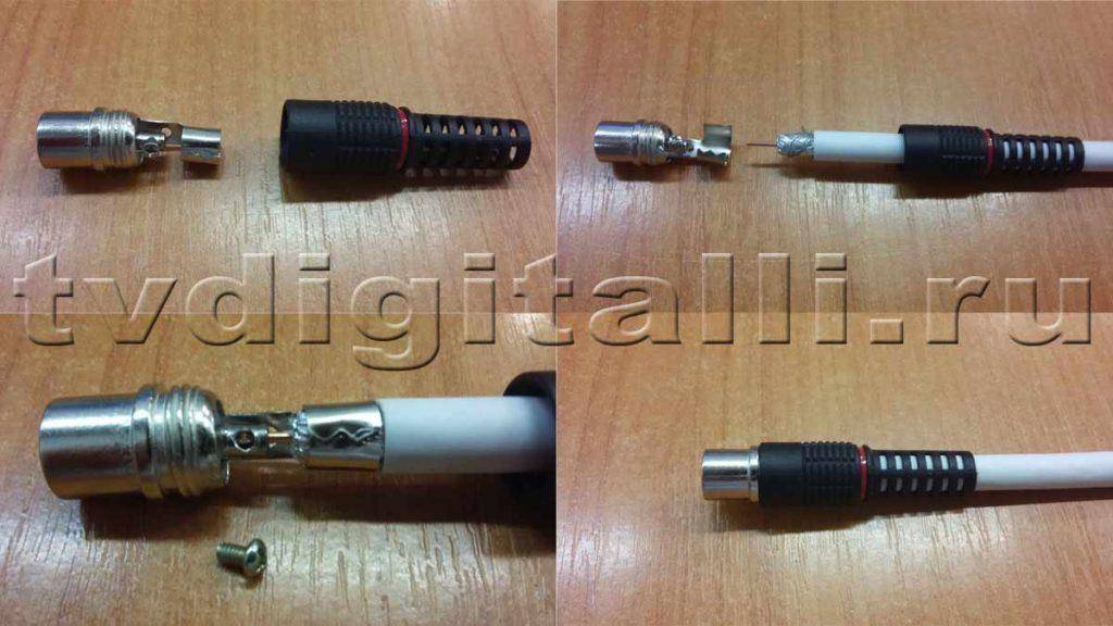 Заправьте коаксиал в штекер следующим образом: хомуток для контакта с экраном поместите поверх оплётки (его нужно обжать вокруг кабеля), а главную жилу пропустите в винтовой крепёж и затяните до упора. Теперь нужно вернуть целостность штекеру, накрутив его полимерную часть на металл.