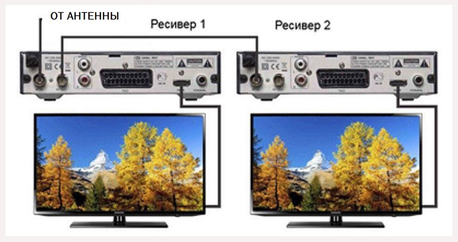 Самый простой способ подключить спутниковое ТВ на 2 телевизора — использовать последовательное включение ресиверов. Схема выглядит так: