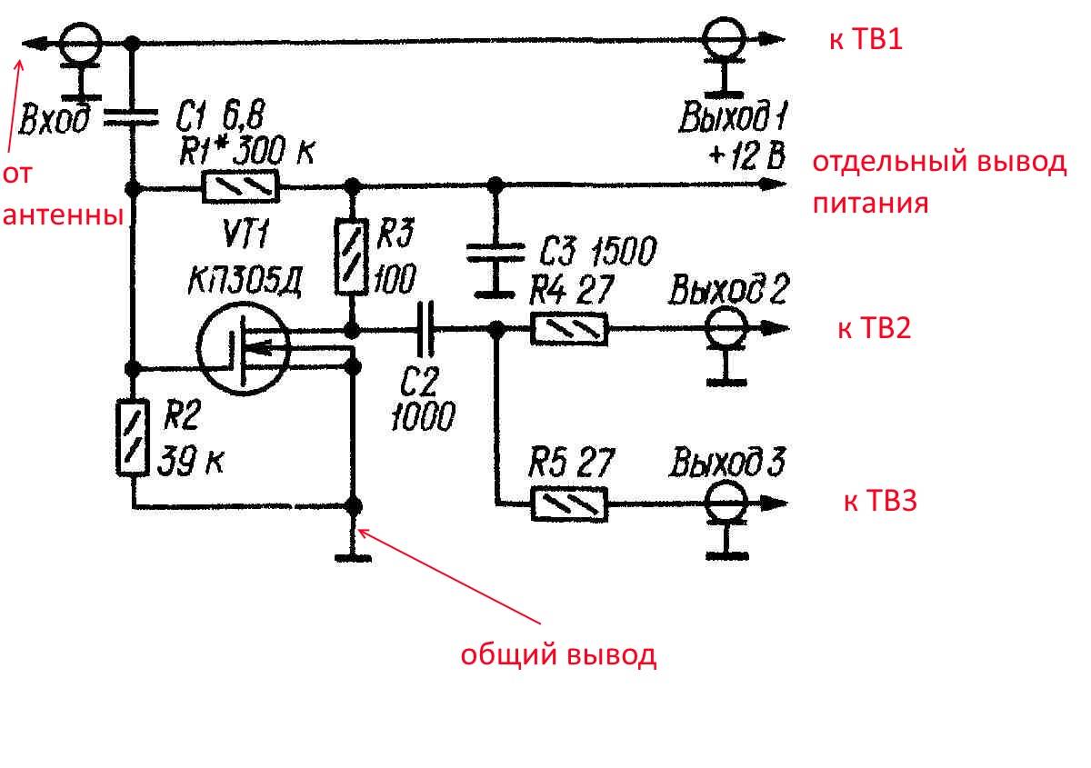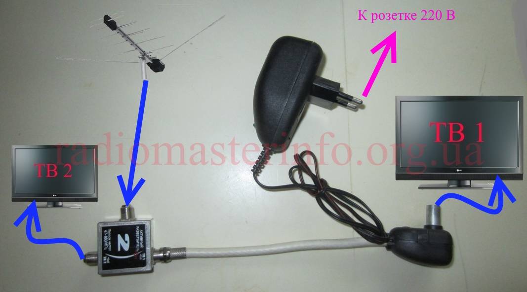 При хорошем приёме достаточно пассивного разделителя. Но при необходимости устанавливаются телевизионные усилители, которые могут работать совместно с антенными. Правда, в таком случае обязательно нужно следить за тем, чтобы сигнал не был чрезмерно увеличен, чтобы не искажалось изображение на экранах. Для этого можно использовать регулируемые блоки питания.
