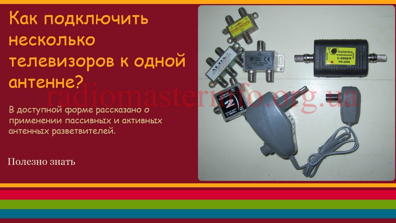 Наибольшее распространение получили активные антенные разветвители с питанием по высокочастотному кабелю. В этом случае можно активный антенный разветвитель установить вместо пассивного в любом месте. Вывод активного разветвителя, по которому поступает питание подключить к одному из телевизоров, рядом с которым расположен блок питания с фильтром. Все остальные телевизоры подключены к остальным выводам активного разветвителя, как и в случае с пассивным разветвителем.