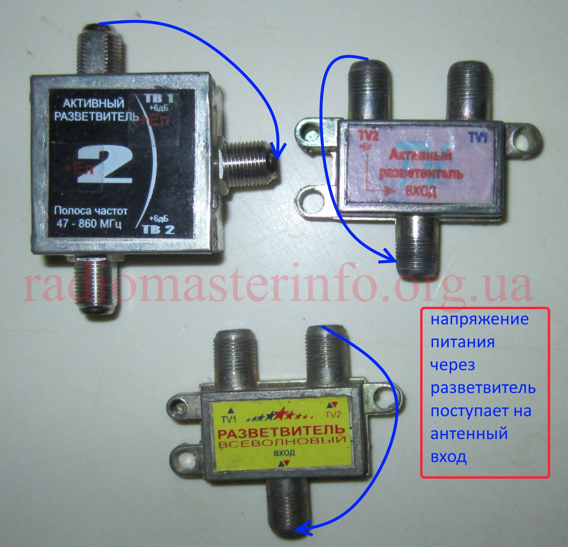 Активный разветвитель с проходным питанием. Используется для питания антенного усилителя, установленного на самой антенне, нельзя применять при разводке кабельного телевидения и сигнала антенны на которой не установлен усилитель.