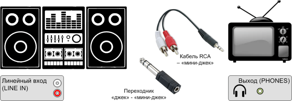 Чтобы связать оборудования, следует на каждом устройстве найти входы под названием Audio Out и Audio In