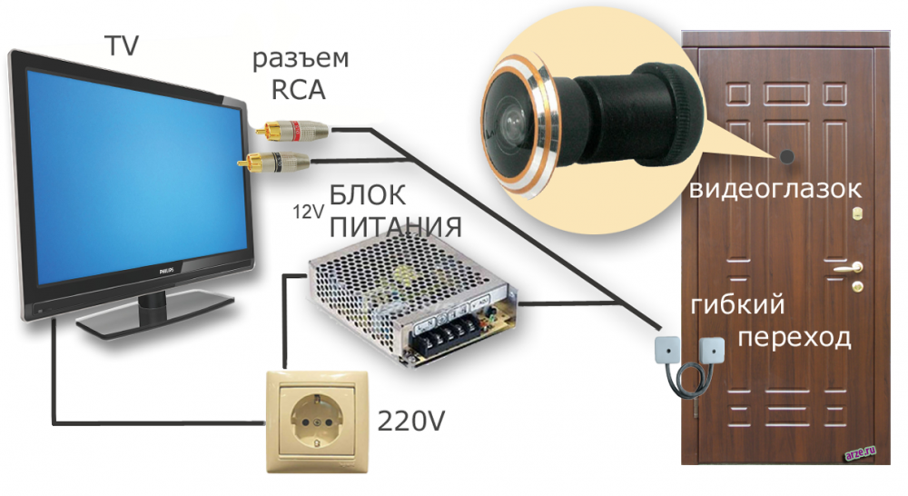 Сначала нужно предусмотреть подачу на видеокамеру питающего напряжения. Затем от видеоглазка до телевизора проложить экранированный провод, соединив центральную жилу с выходом видеосигнала (жёлтый провод), а экранирующую оплетку соединить с чёрным проводом, который является общим для камеры и для источника питания. На кабель со стороны телевизора необходимо распаять разъём «тюльпан» и вставить его в соответствующий вход телевизора.