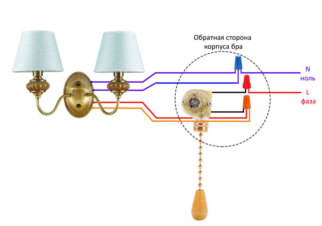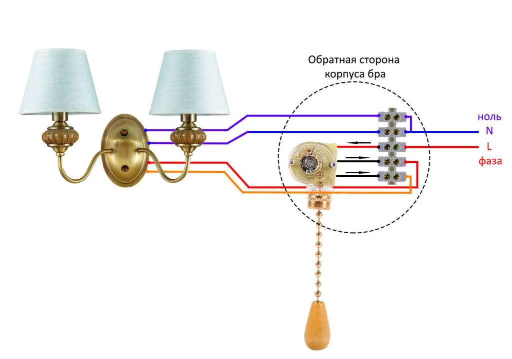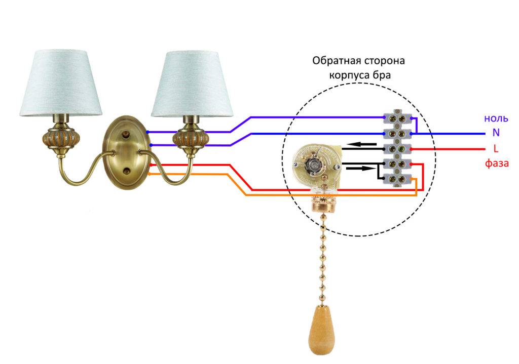 Если вам нужно, чтобы каждый “рожок” или лампочка включались по отдельности, тогда придется использовать выключатель на цепочке с тремя отходящими проводами.