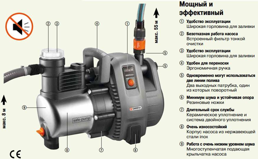 | «GARDENA 4000/2 CLASSIC» | Двухступенчатое рабочее колесо, обеспечивающие высокие эксплуатационные показатели. Телескопическая регулируемая штанга подвеса. Универсальный штуцер-переходник. Встроенная система фильтрации воды. Регулирующий и запорный краны. Мощность – 500 Вт. Длина кабеля – 10 м. Масса – 4.2 кг. | 4000 л/час 20 м вод. ст. 5 м. | 5500 руб. | |