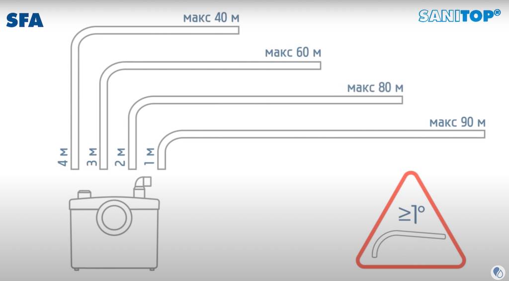 Отдельно оговаривается дистанция между унитазом и стояком. Точных нормативов в этом случае нет, но трубе конструкции нужно обеспечить необходимый уклон — 20-30 мм на метр. Если это условие невыполнимо (для горизонтальных выпусков), то может возникнуть проблема, так как не исключены частые засоры. Большее расстояние от прибора до стояка потребует подъема постамента. Например, если дистанция составляет 4 метра, то высоту его увеличивают как минимум на 80 мм.