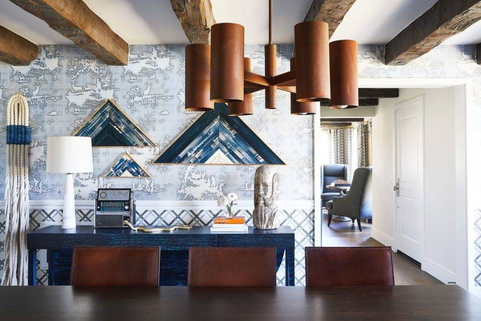 - на 2/3 нижней части стены используются материалы с крупным орнаментом либо тиснением, верхняя часть – монохромная.