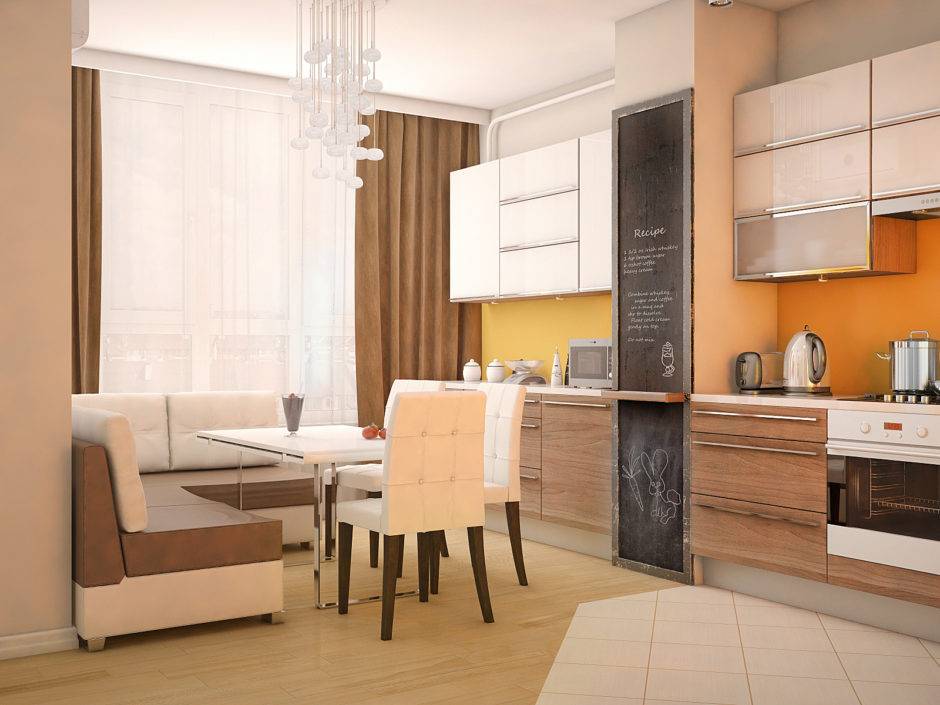 При вытянутой в длину кухне создается эффект вагона, но если оформить противоположную к входу стену обоями с нетрадиционным рисунком или фотообоями, то стена визуально приблизится. Хорошо смотрится акцент на стене рядом с кухонным столом. Яркие обои в этой части позволят создать радостное настроение в момент приема пищи.