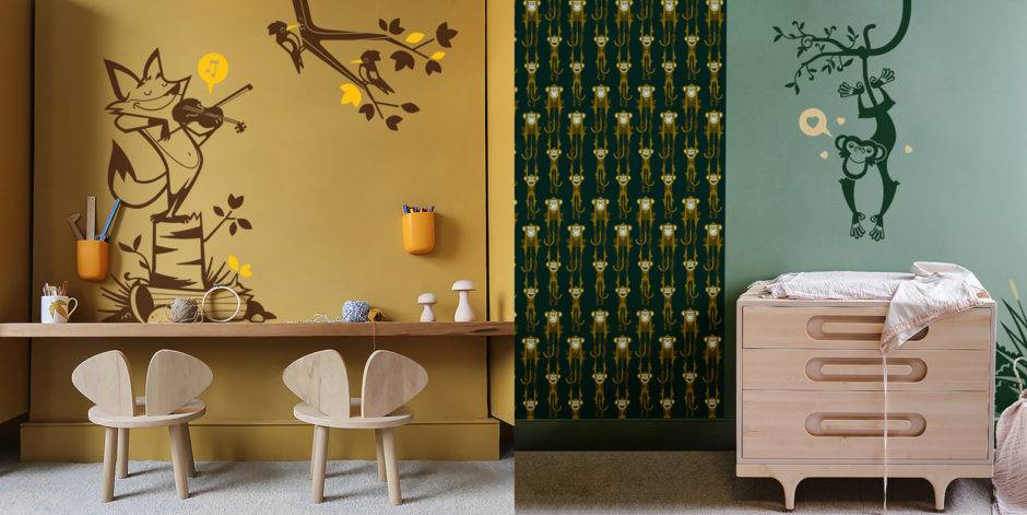 - 1/3 нижней части оформляют листами в полоску, в верхней части используются материалы с мелким рисунком или однотонные;