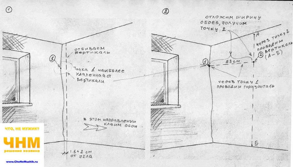 Отмечаем на линии угла в том месте, где она максимально отстоит от нашей нарисованной вертикали, точку и, воспользовавшись строительным уровнем, проводим от этой точки горизонтальную линию, на которой откладываем пятьдесят три сантиметра. Пятьдесят три, это если вы используете обычные обои шириной 53 см (да-да, ширина рулона обоев не 50, а именно 53 см): бумажные, моющиеся с виниловым покрытием и т. п. Если обои имеют другую ширину, соответственно, ее и откладываем.